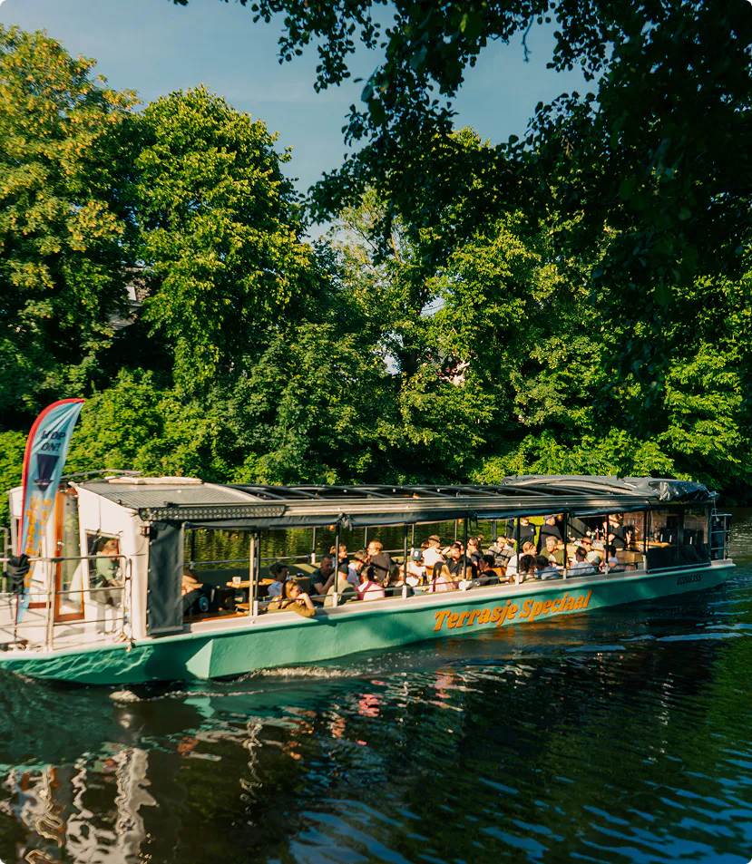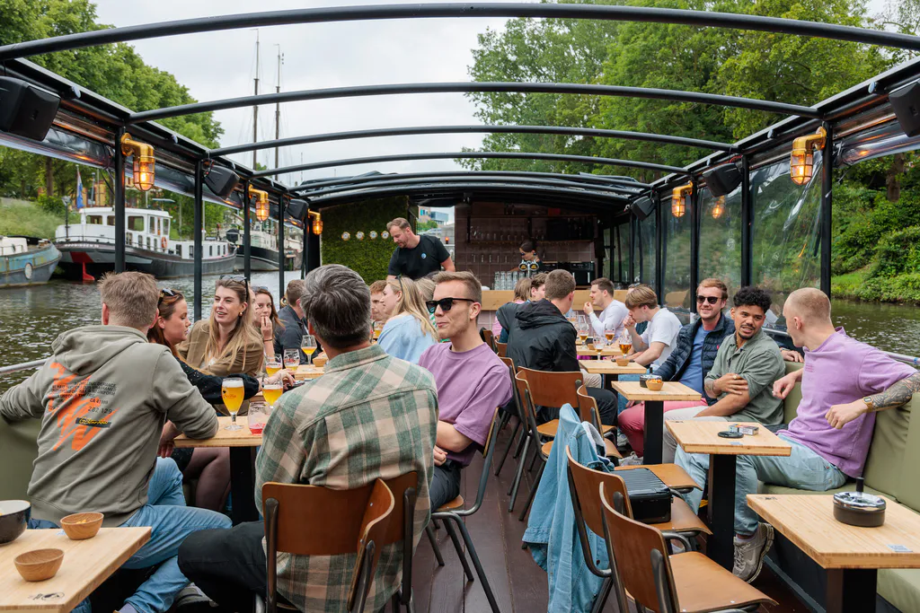 Beleef de Stad vanaf het water op het enige varende terras van Groningen - met bar, muziek, toilet en een dicht dak bij slecht weer.