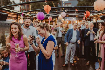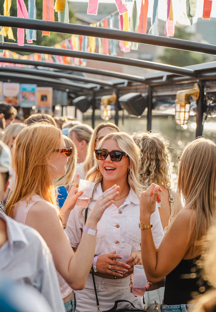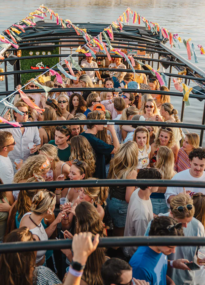 Een gezellige, 2 uur durende Booze Cruise met onbeperkt bier, fris en wijn, goede hitjes, dansen en speelse ijsbrekers om anderen te leren kennen.